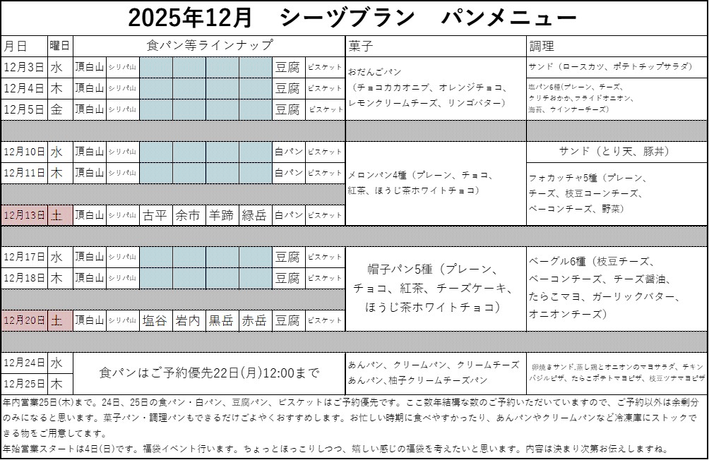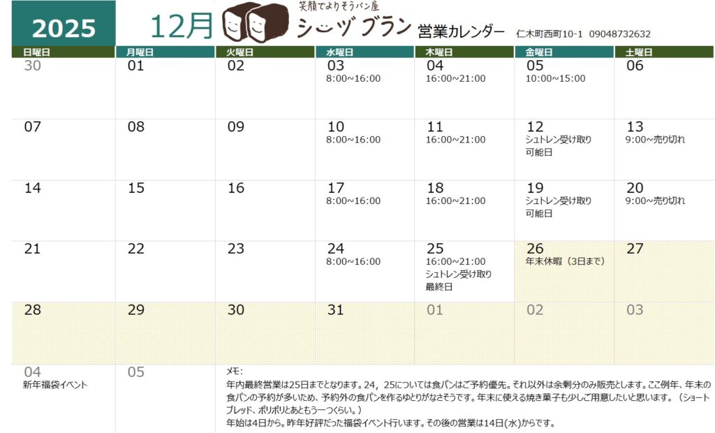 年内最終営業は25日(木)。年始は4日(日)は福袋販売。その後は14日(水)からスタートです。