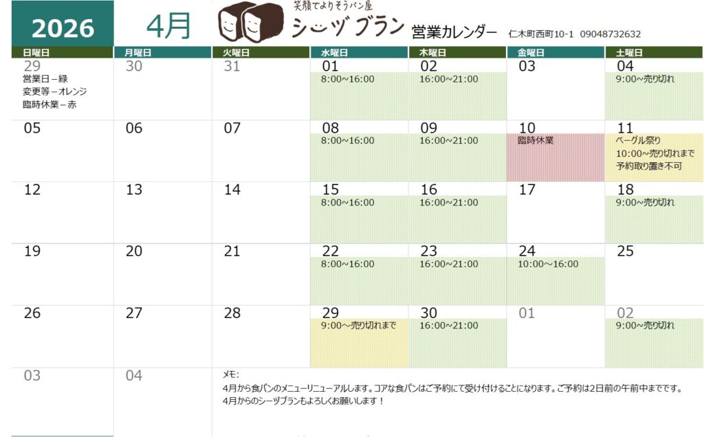 29日(水)は祝日のため9:00~の営業です。